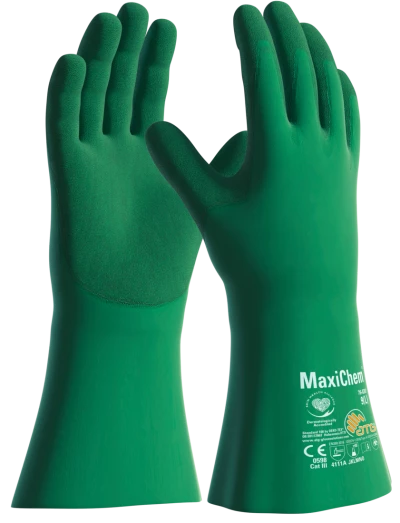 If you are searchng for a chemical protection glove that provides longer and higher levels of protection, the MaxiChem® 76-830 is tested and certified according to EN 374-3. Built using innovative TriTech™ technology, this MaxiChem® 76-830 green nitrile blend coated glove with Nylon/Elastane liner and non-slip grip offers operators a composite, triple-layer design that is 30% thinner and 100% more comfortable than conventional gloves all while maintaining strong mechanical performance. Combined with ATG® LIQUItech® chemical resistance and GRIPtech® oil grip, it’s engineered for enhanced tactile sensitivity, secure grip in oily environments, and reduced hand fatigue. 14-inch length. Green color.